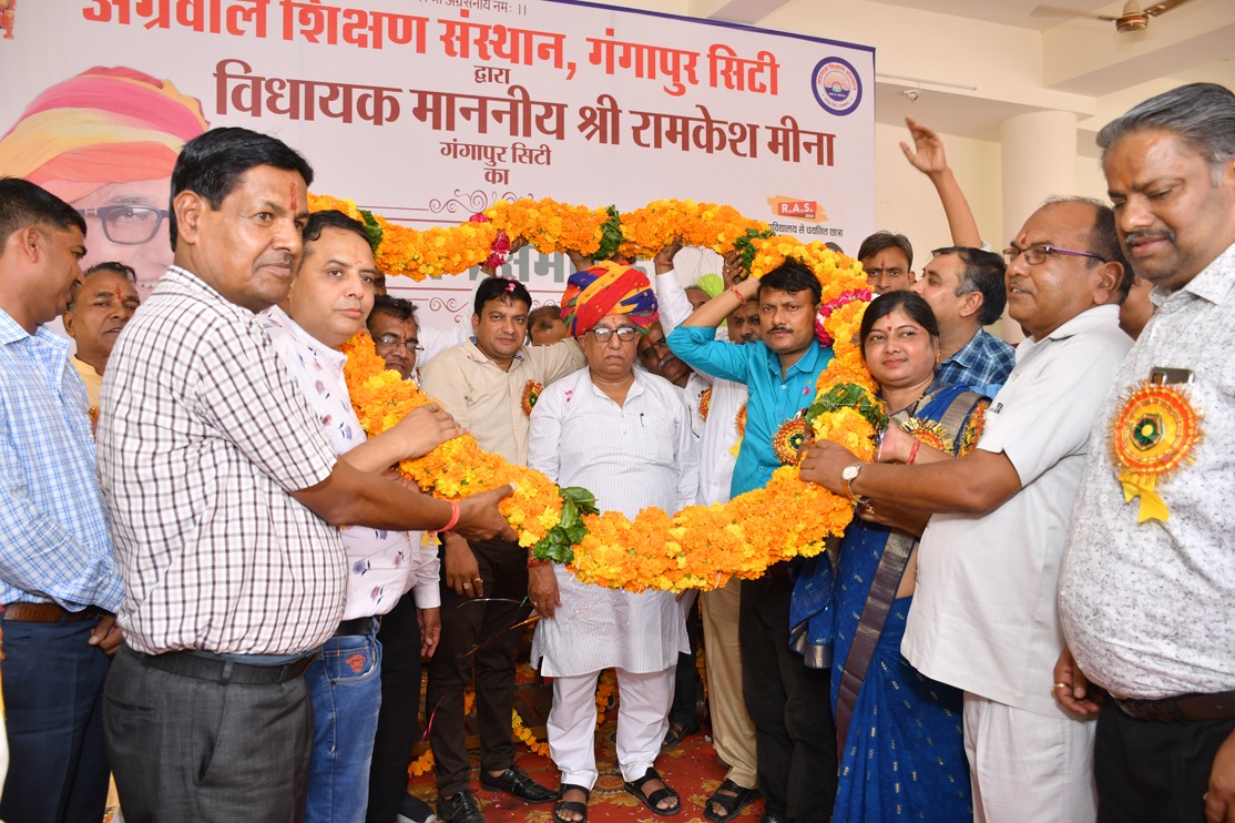 गंगापुरसिटी। अग्रवाल शिक्षण संस्थान की ओर से रविवार को अग्रवाल कन्या महाविद्यालय में विधायक रामकेश मीना का सम्मान समारोह आयोजित किया गया। मुख्य अतिथि विधायक रामकेश मीना, अतिरिक्त जिला कलक्टर नवरतन कोली, उपजिला कलक्टर अनिल चौधरी, अतिरिक्त पुलिस अधीक्षक सुरेशकुमार खीचीं, पुलिस उपाधीक्षक कालूराम मीणा, कार्यक्रम की अध्यक्षता कर रहे संस्थान अध्यक्ष सुदर्शन कुमार मित्तल, कोषाध्यक्ष दीनदयाल गुप्ता, कार्यक्रम संयोजक ओमप्रकाश गुप्ता धर्मकांटा, डॉ. अन्जू गुप्ता, मोहनलाल गुप्ता, धनश्याम अग्रवाल, अरविन्द गोयल पत्रकार, गोविन्द सिंहल, महेश गुप्ता, अशोक गोयल, दुर्लभ गोयल, ओमप्रकाश गुप्ता, गोविन्द प्रसाद, महेन्द्र गर्ग, राजेन्द्र, कैलाश द्वारा मां शारदे के समक्ष द्वीप प्रज्ज्वलित कर कार्यक्रम का शुभारंभ किया गया। संस्थान महामंत्री हरिओम गुप्ता भगत ने विधायक का जीवन परिचय प्रस्तुत किया एवं संस्थान की प्रगति के बारे में बताया। संस्थान उपाध्यक्ष डॉ. अन्जू गुप्ता द्वारा विधायक के सम्मान पत्र का वाचन किया गया। कार्यक्रम में गंगापुरसिटी विधायक रामकेश मीना का समस्त अग्रवाल शिक्षण संस्थान पदाधिकारी एवं कार्यकारिणी सदस्य, अग्रवाल समाज की सभी इकाईयों, सामाजिक संगठनों, व्यापारिक संगठनों, धार्मिक संगठनों, गंगापुर विधानसभा क्षेत्र की सभी ग्रामीण इकाईयों द्वाराके द्वारा माल्यार्पण कर स्वागत किया गया। साथ ही अग्रवाल शिक्षण संस्थान द्वारा विधायक को 21 किलों के फूलों की माला व साफा शॉल पहनाकर एवं स्मृति चिन्ह भेंट कर स्वागत किया गया।