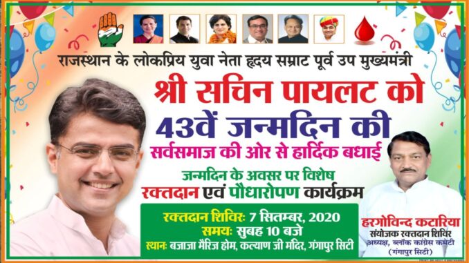 गंगापुर सिटी। गंगापुर सिटी में 7 सितम्बर को पूर्व उपमुख्यमंत्री सचिन पायलट का जन्मदिन धूमधाम से मनाया जाएगा। ब्लॉक कांग्रेस कमेटी शहर गंगापुर सिटी अध्यक्ष एवं रक्तदान शिविर संयोजक हरगोविन्द कटारिया ने बताया कि कल्याण जी मंदिर के पास स्थित बजाजा मैरिज होम में 7 सितम्बर को सुबह 8 बजे रक्तदान शिविर आयोजित किया जाएगा। इसके साथ ही पौधारोपण कार्यक्रम भी रखा गया है।